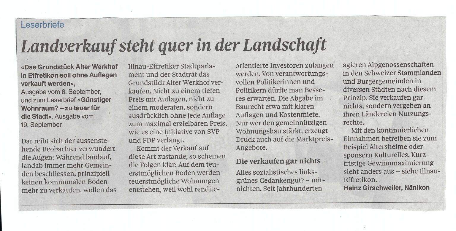 Leserbrief Bodenverkauf Illnau-Effretikon